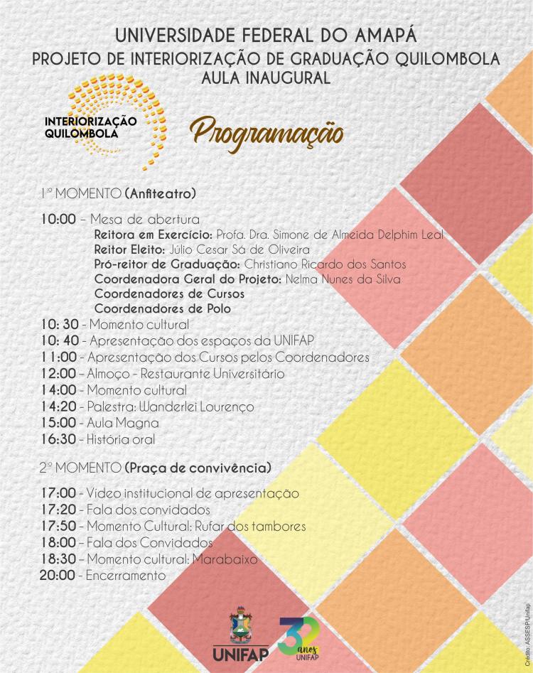 A programação se estenderá por toda a sexta-feira, com apresentação dos espaços da Unifap, aula inaugural, momentos culturais, almoço no Restaurante Universitário, palestra e evento de encerramento. Na mesa de abertura, estarão presentes o reitor eleito da Universidade, Prof. Dr. Júlio Sá; a vice-reitora em exercício, Profa. Dra. Simone Leal; o pró-reitor de Graduação, Prof. Dr. Christiano Ricardo dos Santos; a coordenadora-geral do projeto, Profa. Dra. Nelma da Silva; coordenadores dos cursos de graduação; e coordenadores dos polos que serão implementados nas comunidades quilombolas.