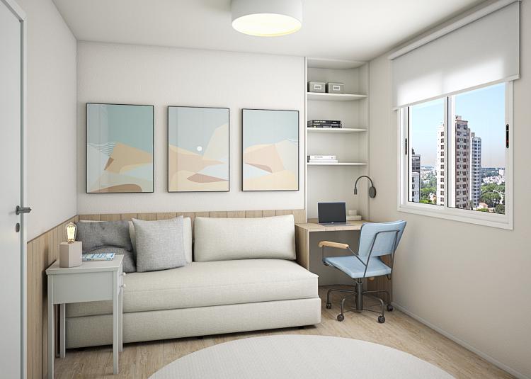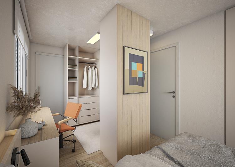 homogeneidade no quarto e no closet. Esse segundo, sem portas nos armários porém, deixamos as prateleiras um pouco mais recuadas para caso, algum dia, eles desejem colocar portas, conta Rafaela.