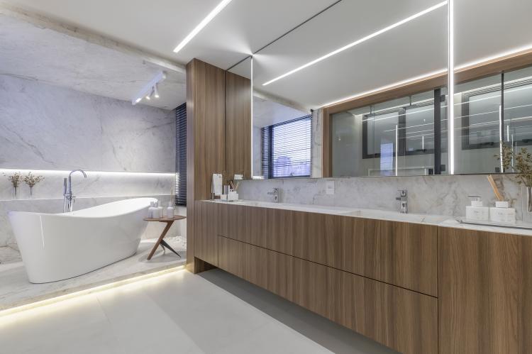 O banheiro é o local mais íntimo da casa e é o espaço de atividades que demandam atenção especial, como: maquiagem, fazer a barba, cuidar da higiene pessoal e desacelerar da rotina. “O projeto luminotécnico do banheiro é importantíssimo. Hoje, temos à disposição lâmpadas inteligentes que são controladas pelo celular, comandos de voz ou assistente virtual e tem funcionalidades como desligar e ligar, ajuste de intensidade da luz e até alterar a cor da iluminação”, detalha a arquiteta. Já a automação da sonorização ambiente é o controle de caixas de som que permitem configurações especiais que promovem diversão e relaxamento.