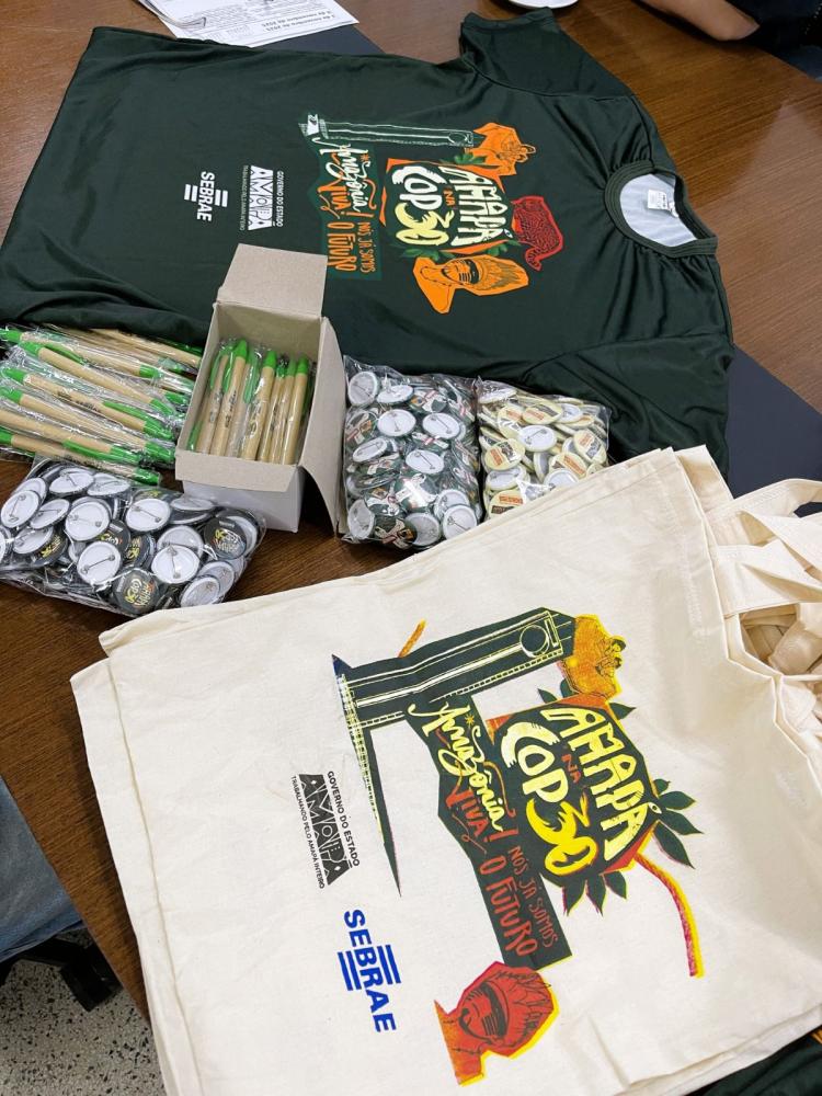 O material inclui camisetas, ecobags, bottons, canetas e outros materiais personalizados com a logo do evento e identidade do Amapá, que serão utilizados na divulgação institucional e ambientação do estande do Estado durante o evento.