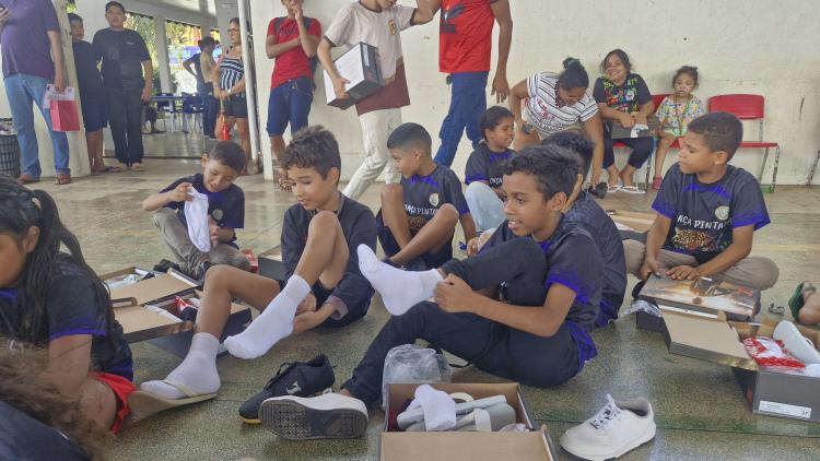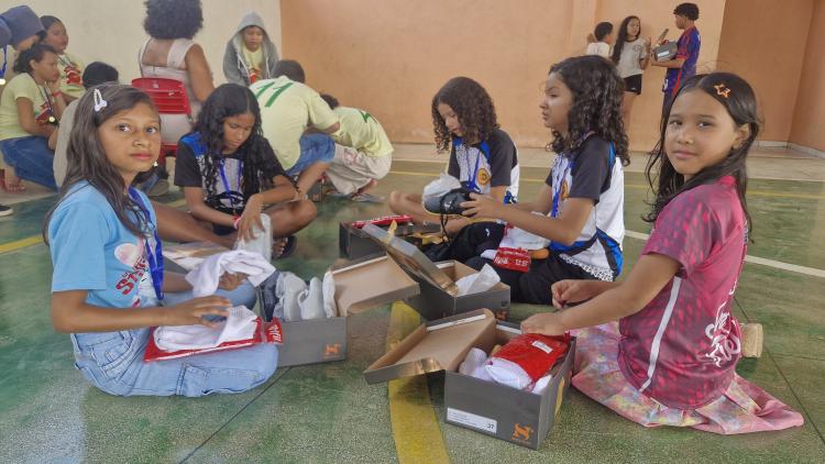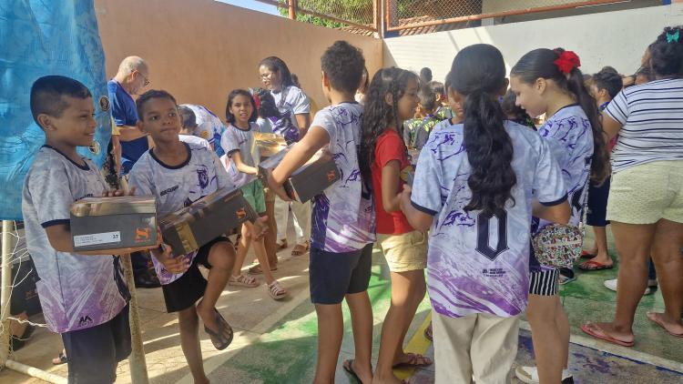 Após a entrega das medalhas, foi a vez da distribuição dos kits esportivos, compostos por chuteiras, dois pares de meias e sandália. O material foi entregue a todos os alunos, independentemente da colocação nas modalidades disputadas.
