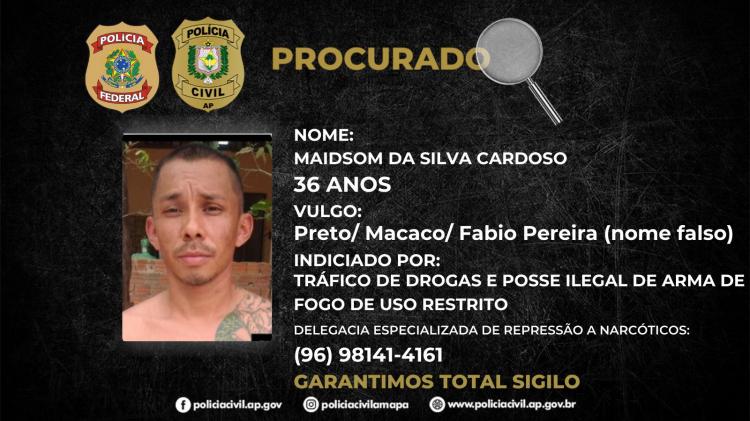 Nesta quarta-feira, 31, a Polícia Civil do Estado do Amapá, por meio da Delegacia Especializada de Repressão a Narcóticos (DENARC), em investigação conjunta com a Polícia Federal (PF/SR/AP), através do NEPOM – Núcleo Especial de Polícia Marítima, encerrou investigação que foi instaurada no mês de setembro para desarticular esquema criminoso de transporte de armas de fogo e drogas através do Amapá e divulga a imagem de Daniel Marques, vulgo Colombiano, de 41 anos e Maidsom Cardoso, vulgo macaco/ preto ou Fabio Pereira (nome falso), de 36 anos.