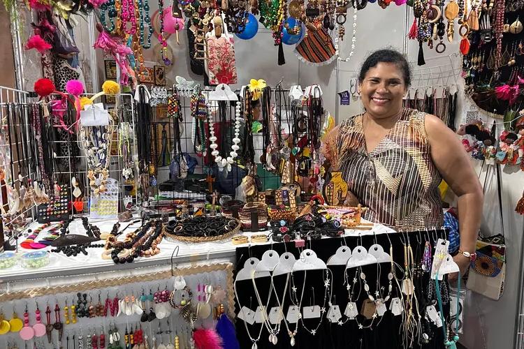 Dos cocares aos colares e brincos de animais coloridos, Juliana Santos, de 20 anos, da etnia Galibi-Maworno, fatura nas vendas na 54ª Expofeira d...