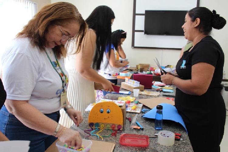 Com caixas de papelão, panos, potes, garrafas de plástico, cotonetes e outros materiais, mães, pais e crianças com Transto...