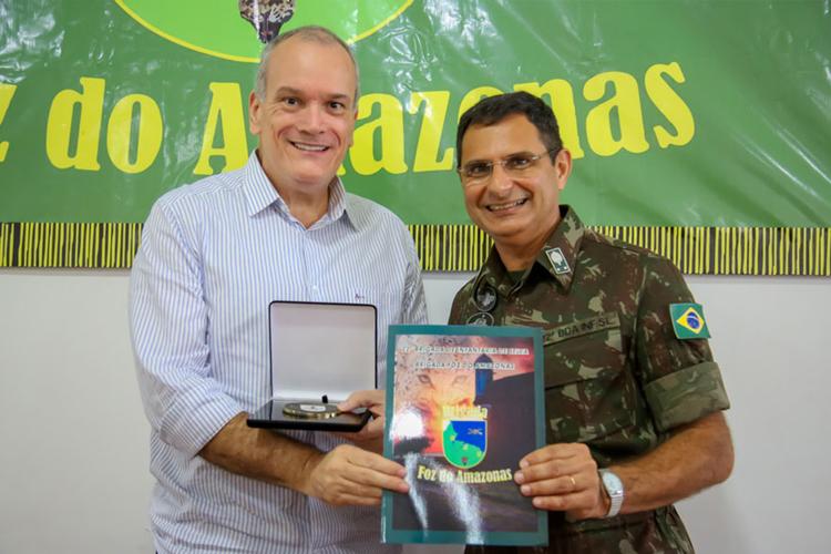 Nesta quarta-feira, 13, o governador em exercício, Jaime Nunes, foi condecorado com o medalhão de reconhecimento aos agentes públicos que contribuem com o trabalho da 22ª Brigada de Infantaria de Selva – Foz do Amazona...